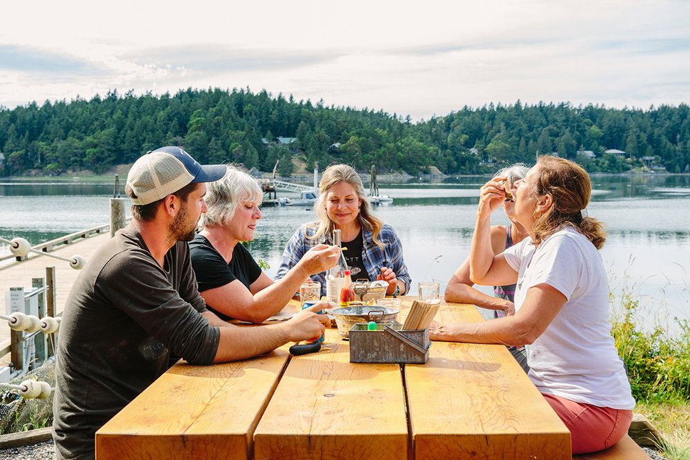 Growers of clams, mussels, and oysters, we highlight the splendors of the sea, with the seasonal crops of the islands, to bring you a taste of our island community. Reservations are available May - October for The Tide Tables restaurant, located on the edge of the beach, overlooking our cultivated tidelands. There is no better place to enjoy some oysters and see where they grow. All seating is outdoors, so come prepared for the weather! Reservations are highly recommended, and available for 1-20 people May - October. All reservations are for 1.5 hours based on your reservation start time. Parties of 8+ will be served family style. Walk-in space at the Tide Tables is extremely limited, so we have opened up our Net Shed Market where you can enjoy our freshly harvested raw oysters, and the makings for a perfect picnic. All seating at the Net Shed is first come first serve, so if reservations aren't available you can always come out to the Net Shed to slurp down some oysters!