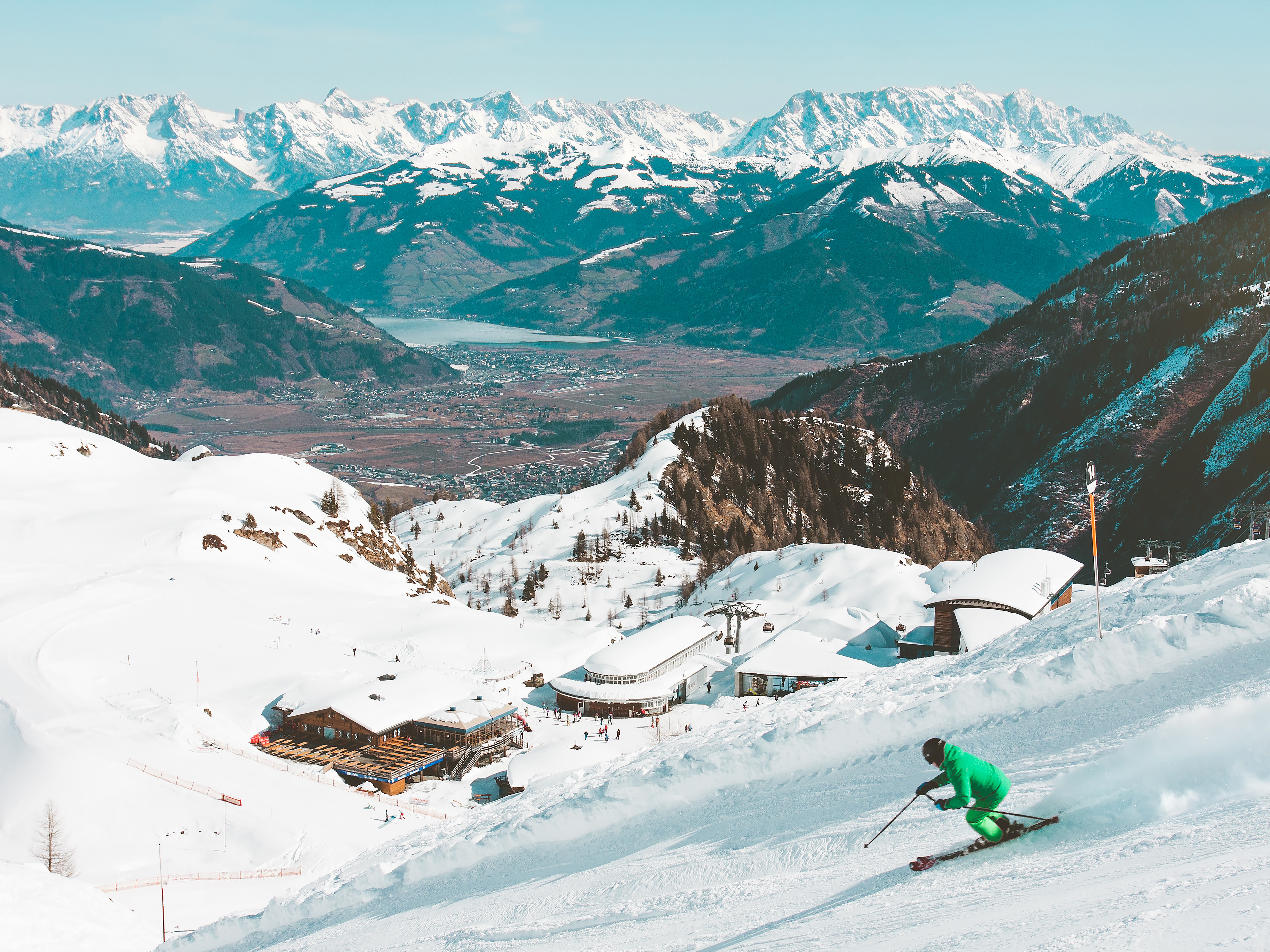 Located directly on the ski slopes of Saalbach-Hinterglemm and framed by age-old mountains, a white four-story house rises above an ensemble of minimal, modern buildings with floor-to-ceiling windows.