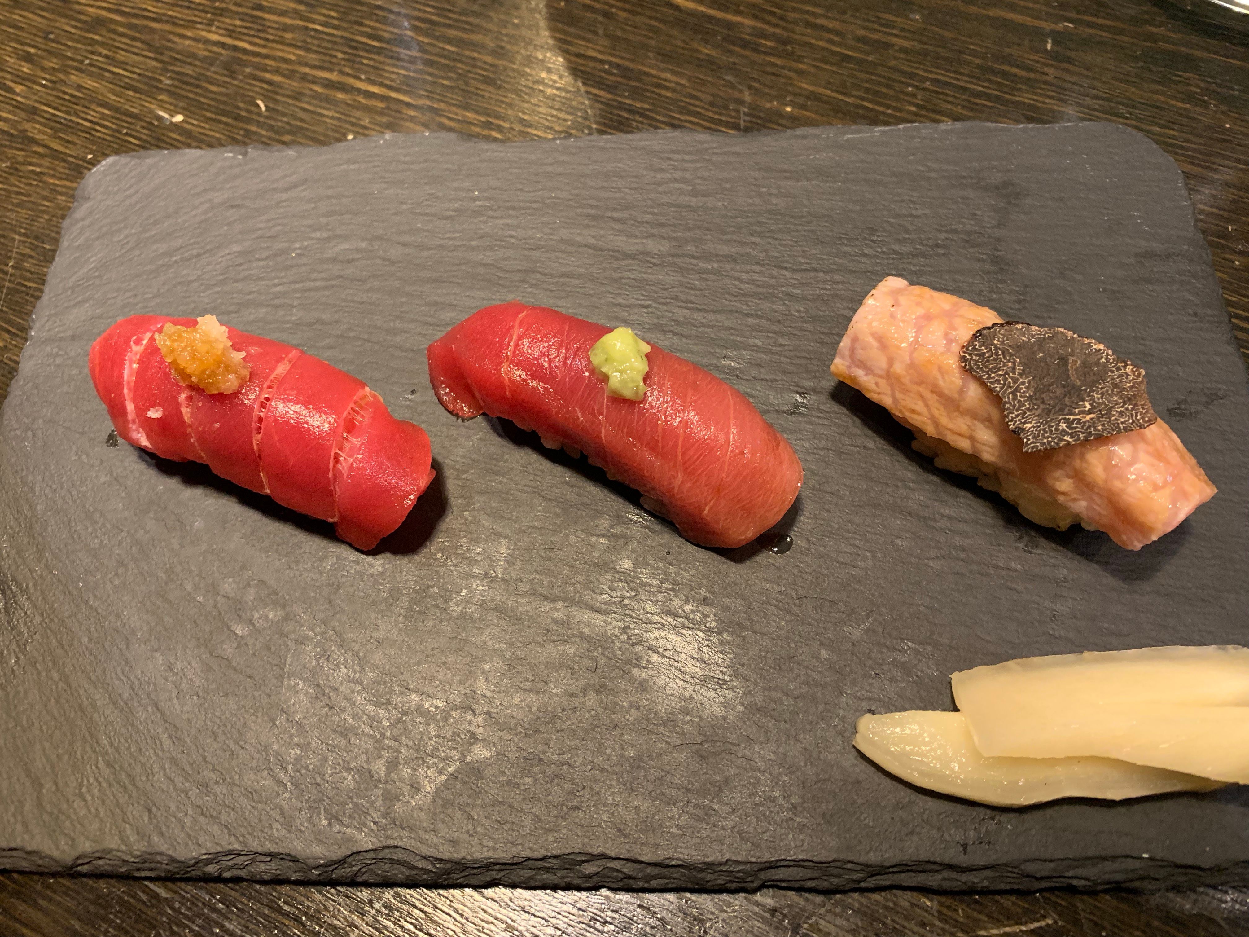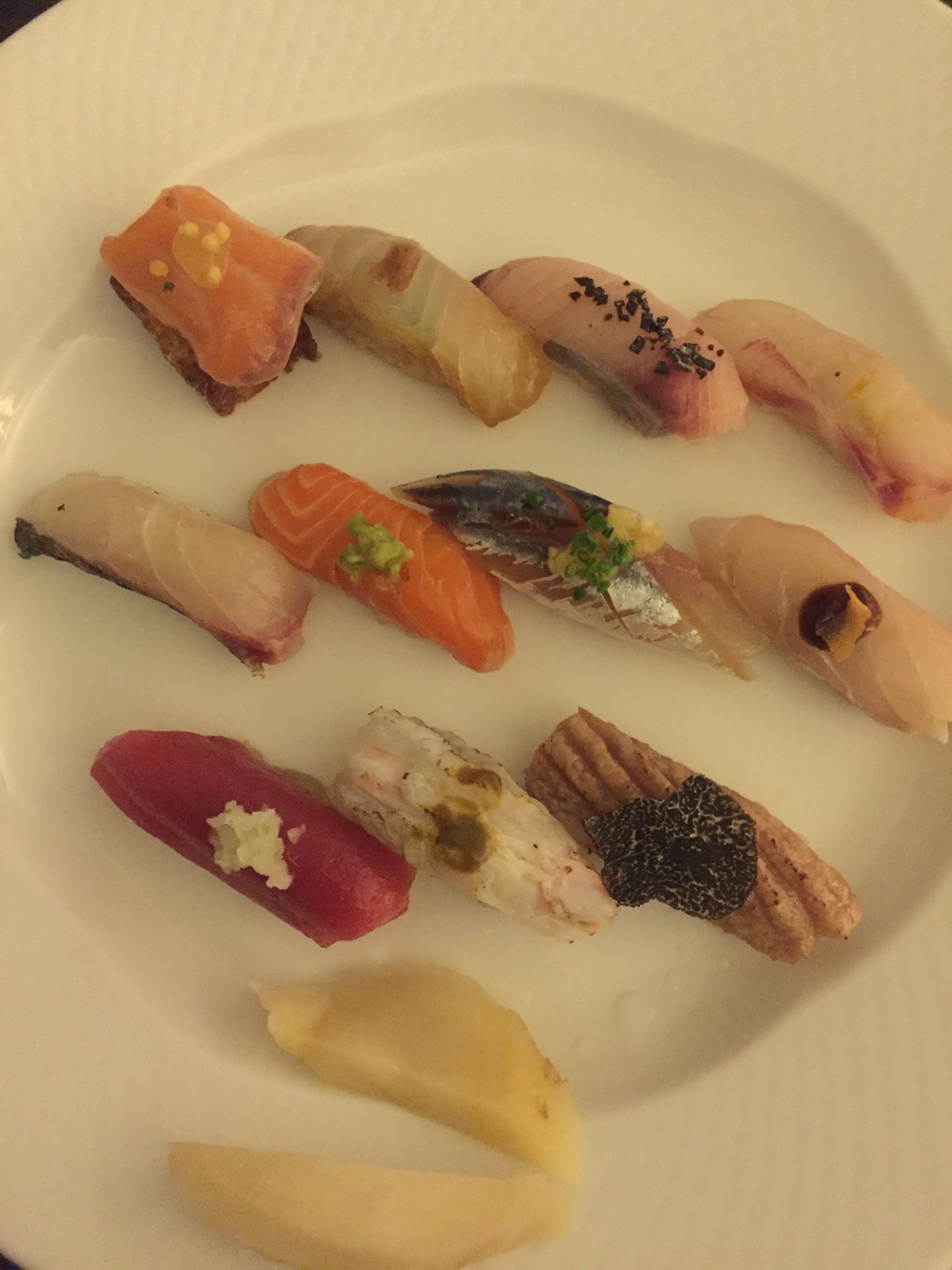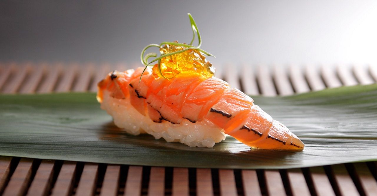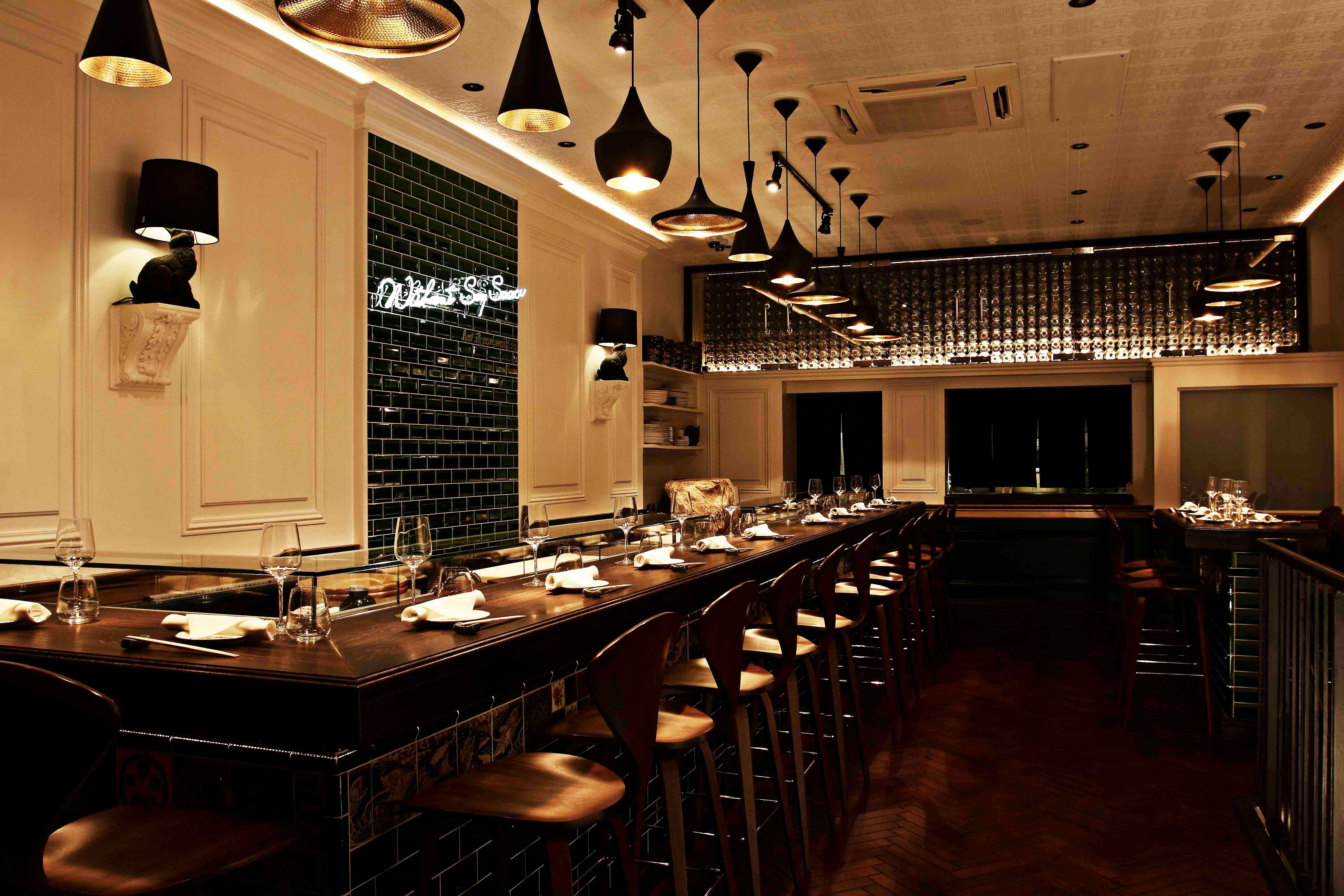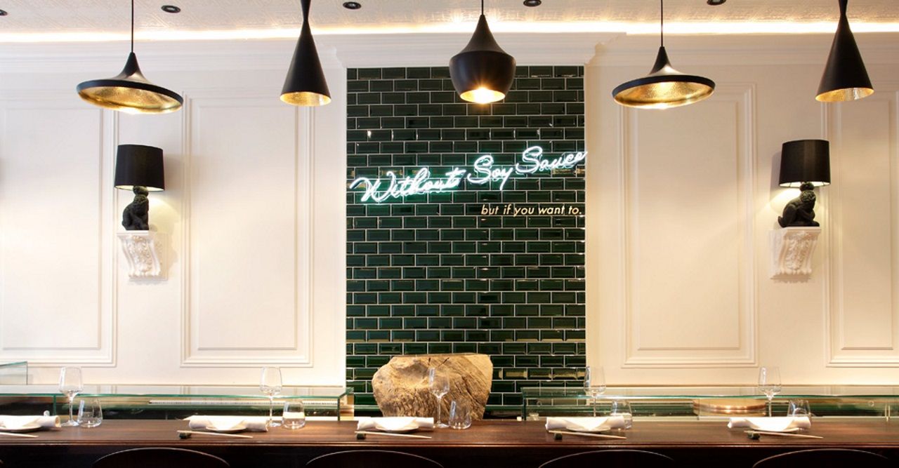 Hidden away off of Kensington’s famed High Street, Yashin Sushi is an upmarket take on the popular open kitchen style of sushi restaurant. Seated around the central kitchen area, diners enjoy the spectacle of food being prepared in front of them, skill of sushi rolling displayed for all to see. If you can take your eyes off of the chefs, you’ll find yourself in an exceptionally modern dining room, all monochrome colour scheme and designer lighting. Yashin Sushi’s menu is made up of both traditional and contemporary sushi and sashimi, sensibly priced to reflect the extremely high quality of the ingredients that go in to every item.Our sushi concept is “without soy sauce – but if you want to”. Of course, we can serve as much soy sauce as the diner desires; however, what we want to emphasise is the taste of the fish. Therefore, each piece of sushi that we serve is brushed with the right amount of soy sauce and topped with an accompaniment that harmonises with the flavour of t